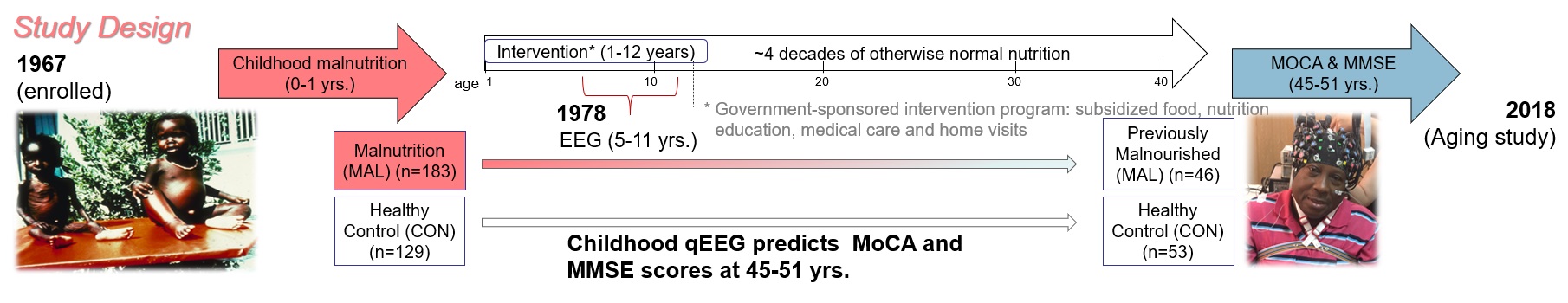 The BNS is a 45-years longitudinal study which has compiled follow up information of a group of Barbadian children who suffered Protein energy malnutrition (PEM) during their first year of life. 45 years after this group of persons show signs of early aging and cognitive decline, as well as other psychological and physiological sequalae. Novel statistical mediation methodology is being used to describe the role of the metabolic, nutritional, economical, psychological, brain electrical activity and all existing information, combined to produce these alterations of the normal development.